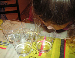 У нас осталось последне средство: ВКУС! Предложите ребенку попробовать жидкости и определить, что в стаканчиках. Я думаю, что он великолепно справится с этой задачей!