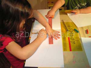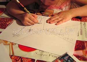 Вооружившись линейкой и карнадашом, приступаем к эскизу на бумаге. Попросите малыша поставить точку в произвольном месте, а потом из нее помогите ему нарисовать произвольные линии. Это поможет ребенку увидеть схему будущей картины. По законам перспективы, предметы, находящиеся ближе к краю листа - крупные, по мере приближения к центру перспективы, они уменьшаются. Поэтому нарисуйте для примера такие предметы с одной стороны. и предложите ребенку повторить рисунок, с другой стороны.